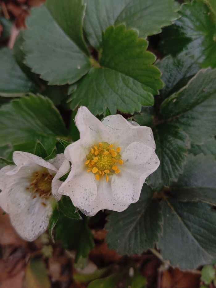 A close-up photograph displays two white, five-petaled flowers, each exhibiting a prominent yellow central cluster of stamens. The petals of both flowers are dotted with numerous small, transparent droplets or particulate matter. These flowers are partially encircled by dark green, trifoliate leaves featuring serrated margins, consistent with a strawberry plant. The background is rendered out of focus, revealing blurred dark brown and green tones, indicative of soil or organic ground cover. No human subjects or discernible actions are present within the frame. The depicted scene is located in Lassan, Pakistan.