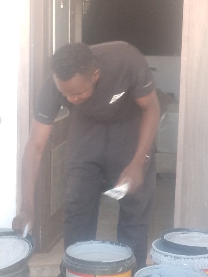 The scene depicts an adult male engaged in an activity at a doorway threshold in Kwang, Nigeria. The individual, dressed in a black short-sleeved t-shirt with a white logo on the left chest and dark trousers, is bent forward with his head lowered, directing his attention towards three open buckets on the ground in the foreground. These buckets contain a light grey, viscous substance, consistent with paint or plaster. The man's left hand is positioned above the leftmost bucket, while his right hand holds a small, light-colored flat tool, possibly a trowel or scraper. The background reveals a dimly lit interior space through the doorway, with light appearing to enter from the left side of the frame.