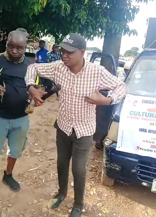 man dancing and speaking into a microphone in an outdoor setting. The man is wearing a plaid shirt, dark pants, black shoes, and a baseball cap. He is holding a microphone in his right hand and gesturing with his left. Next to him is another man in a black shirt, denim shorts, and black shoes, holding a bottle. Behind them, a blue van is parked, with a sign on the front reading "Enugu State Cultural Fund Raising... His Highness." Other people are visible in the background, including a few men who appear to be police officers. The ground is a mix of dirt and gravel, and there are trees in the background. The overall tone seems celebratory or event-driven.