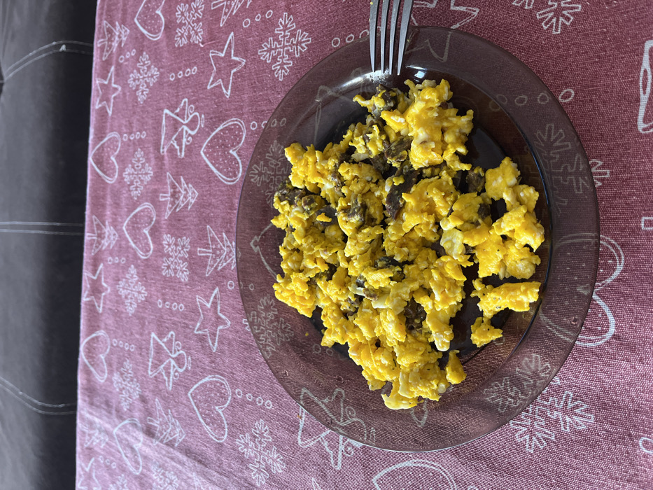 The image displays an indoor scene, likely a dining or living area. In the foreground, a translucent dark glass plate contains a portion of scrambled eggs, characterized by their yellow and white coloration, intermixed with irregular dark brown pieces, possibly meat or mushrooms. A silver metal fork is partially visible, resting on the right side of the plate. The plate is positioned on a red-hued tablecloth patterned with repeating white outlines of snowflakes, hearts, and stars. In the background, a dark brown upholstered surface, consistent with a couch or sofa, is visible, featuring distinct stitching lines across its surface. No individuals are present, and no actions or interactions are depicted. The specific location within the city of Popovo, Bulgaria, cannot be determined from the visual information provided in the image.