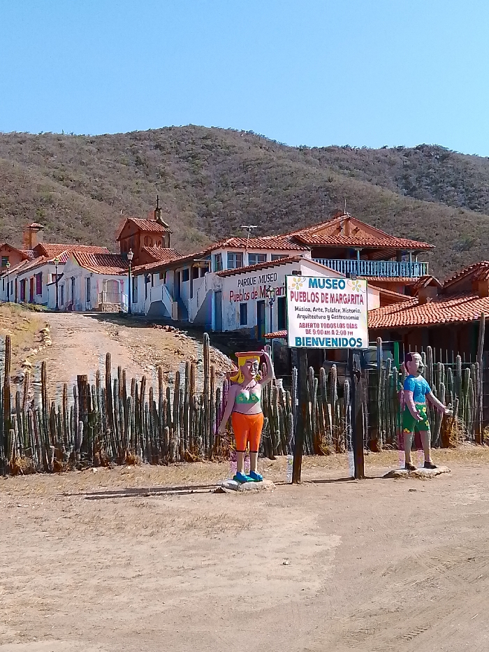 A daytime, wide-angle image depicts the entrance to the "Museo Pueblos de Margarita" (Museum of the Peoples of Margarita) in La Guardia, Venezuela, set against a backdrop of arid hills