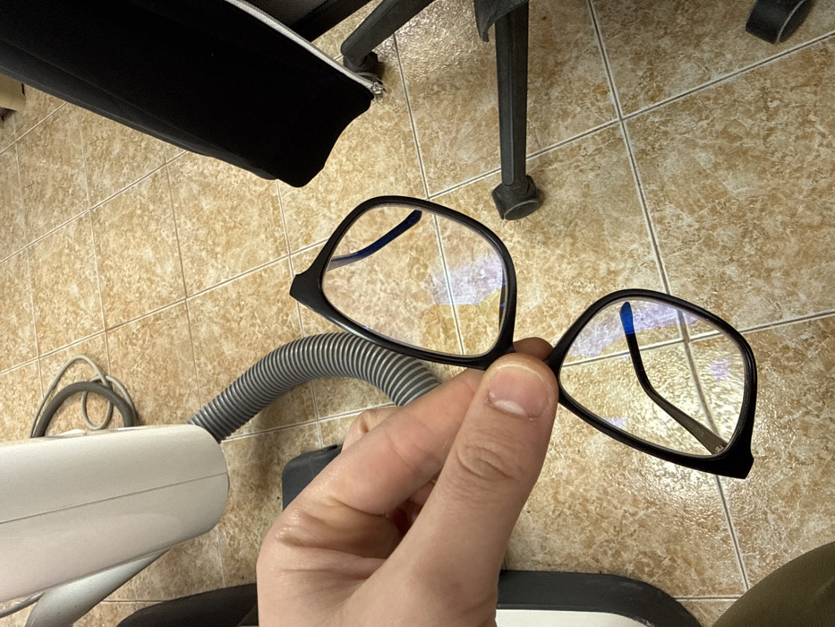 A close-up, downward-angled image in Popovo, Bulgaria, displays a person's light-skinned hand holding a pair of broken black-framed eyeglasses. The eyeglasses feature clear lenses with blue light-filtering reflections, and a visible fracture is present in the upper-left portion of the frame, above the left lens. The hand grasps the frame with the thumb and forefinger on the bridge and the middle finger supporting the lower-left lens frame. The background consists of a light brown tiled floor with darker grout lines. On the left, a white vacuum cleaner unit with a grey corrugated hose and a dark power cord is partially visible. On the right, a segment of a black office chair's five-star base and a portion of its black fabric seat or backrest are present.