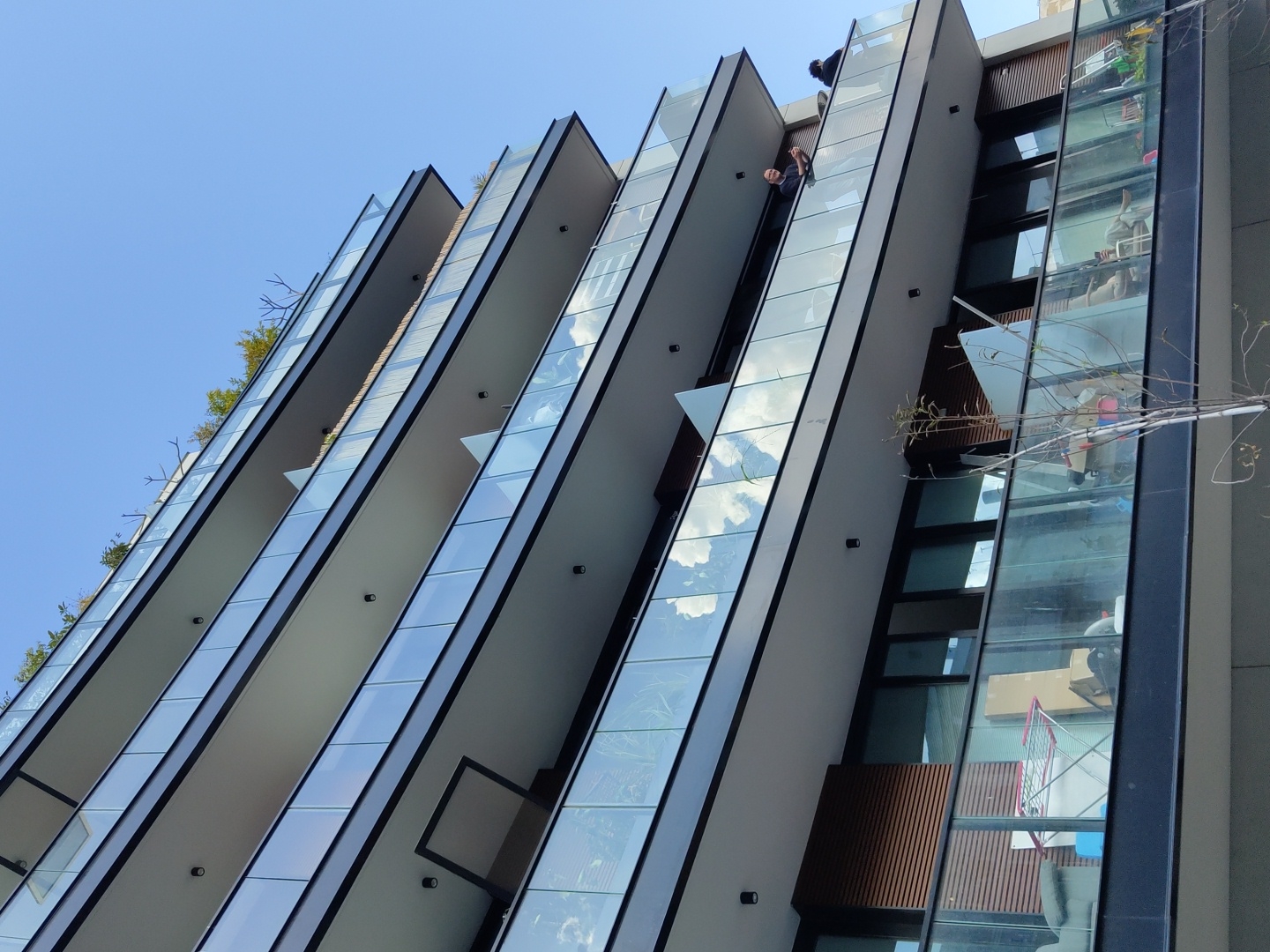 A modern, multi-story building featuring tiered balconies with clear glass railings and dark framing is depicted under a clear blue sky in Al Jizah, Jordan. The building's facade is characterized by light-colored soffits and some sections with horizontal wooden slat paneling. Five distinct levels of balconies are visible. The uppermost visible level displays green foliage. On the fourth visible balcony from the bottom, a male individual in a dark shirt stands at the glass railing, looking left, with a second, partially obscured individual in dark clothing standing beside him. The third visible balcony from the bottom contains household items including a red and white clothes drying rack with laundry, cardboard boxes, a grey armchair, and a person seated in a light-colored chair, holding a mobile device. The glass railings reflect white cumulus clouds against the blue sky. A bare-branched sapling is present in the immediate foreground, positioned at ground level relative to the building. The scene is illuminated by bright daylight.