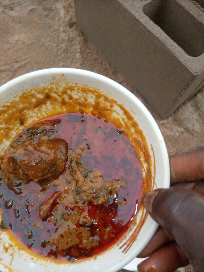 A bowl of stew is held in someone's hand. The stew appears to contain meat, vegetables, and a rich red sauce. A tan brick with two square holes in it rests in the background. The stew bowl is white and has an orange and tan coating. The background surface looks sandy. The colors of the food are predominantly brown and red.