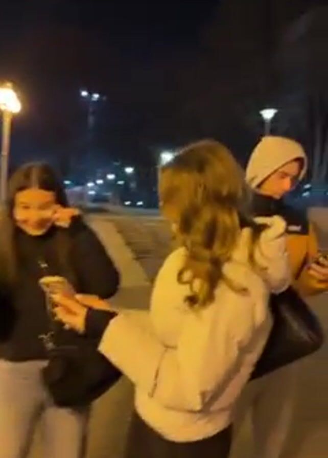 A group of young women are outdoors at night. They are standing on a paved area with trees, benches, and streetlights. There's a building with blue lights in the background. One woman holds her phone, filming. She turns the camera to show herself, sticking out her tongue. Later, she films other women, focusing on their hands.