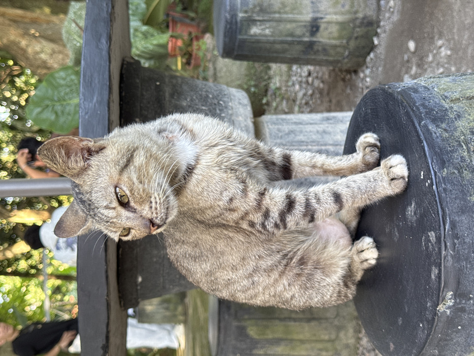 - "A domestic tabby cat, displaying a brown and grey striped coat with a white chest patch and yellowish eyes, sits upright on a dark, cylindrical concrete stool" by FM-octGQ2, licensed under CC BY 4.0
