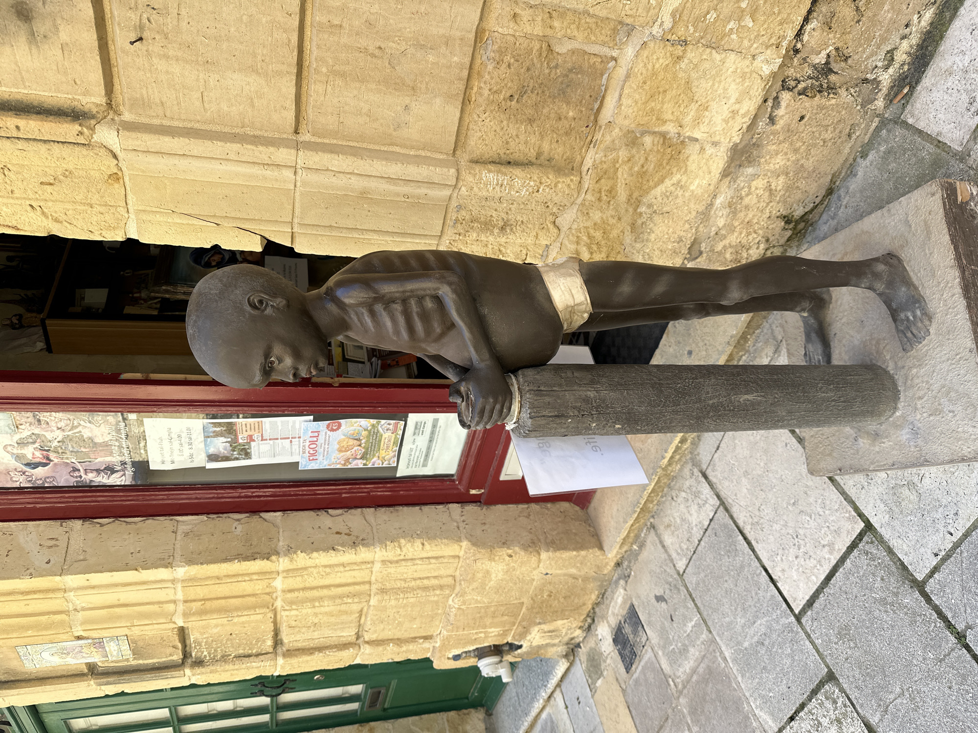 A bronze-colored statue depicting a severely emaciated child, naked except for a light-colored loincloth, stands on a light grey stone base on a sidewalk in Victoria, Malta