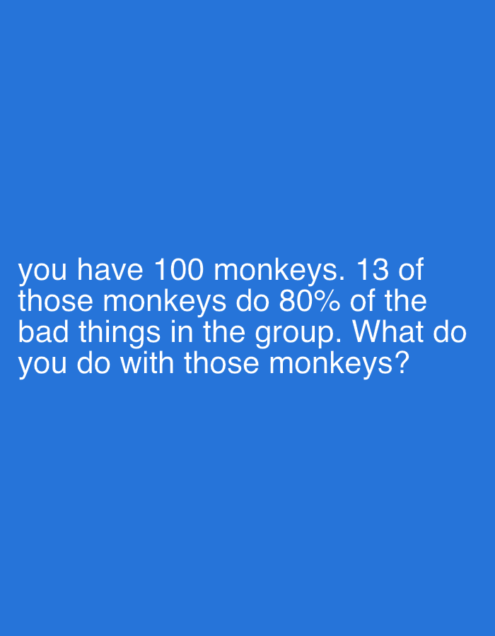 The image displays white sans-serif text against a solid, uniform blue digital background. The text occupies the lower half of the frame and reads: "you have 100 monkeys. 13 of those monkeys do 80% of the bad things in the group. What do you do with those monkeys?" The scene contains no visual elements depicting people, animals, physical objects beyond the text, actions, interactions, or an identifiable physical environment. There are no discernible visual cues within the image to indicate a specific geographic location, including any part of the city of Boston, United States.