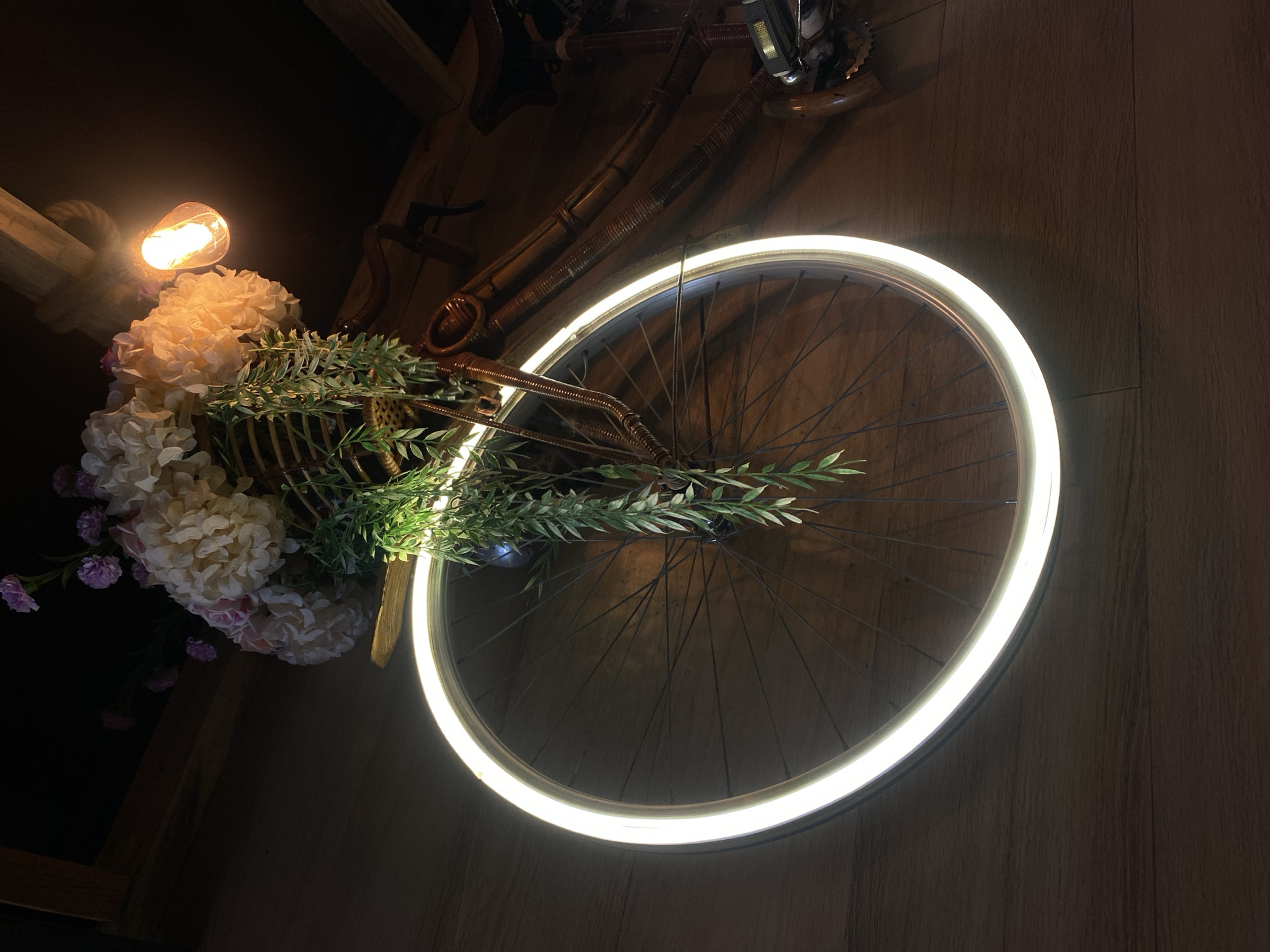 A decorative, antique-style bicycle is mounted on a dark wooden plank wall in an interior setting in Valencia, Venezuela. The bicycle's front wheel is illuminated by a bright, circular LED light strip embedded within its rim. A woven basket attached to the handlebars holds an arrangement of artificial flowers, consisting primarily of large pale pink and white blossoms, with smaller purple flowers, and cascading green foliage. An exposed, glowing incandescent filament light bulb hangs from above the floral arrangement, emitting a warm orange light. Dark wooden beams or structural elements are visible in the upper background, with a rope wrapped around a beam on the upper right. The bicycle frame itself appears to be constructed from dark, possibly rattan-wrapped, wood. The scene is dimly lit, with the LED wheel and the incandescent bulb serving as primary light sources.