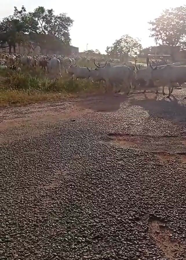A herd of light-colored cattle with large horns is walking across a gravel road. Trees are visible in the background. The sky is bright.