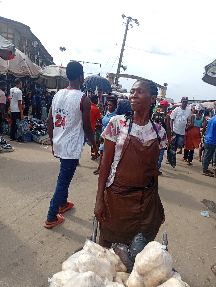 The image displays a bustling outdoor market scene in Onitsha, Nigeria, under an overcast sky. In the foreground, a dark-skinned woman, wearing a white and floral pattern short-sleeve shirt beneath a brown full-body apron, stands beside a black pushcart. Her expression is neutral as she gazes towards the right of the frame. The pushcart is loaded with numerous pale, irregularly shaped tubers, each individually enclosed in a clear plastic bag, with some darker items interspersed. To her left and slightly behind her, a dark-skinned man walks away from the viewer, wearing a white basketball jersey with "CHICAGO 24" printed in red on the back, blue jeans, and reddish-orange slide sandals. The midground and background reveal a crowded market street lined with various stalls and vendors. These structures feature dark tarpaulins and lighter canvas awnings. Merchandise, including shoes and bags, is visible on the ground and displayed under the coverings. A tall, dark utility pole equipped with two conical loudspeakers is prominently positioned against the bright, featureless sky. Numerous other individuals are present throughout the market, moving between stalls. The ground surface is a textured, light gray pavement.