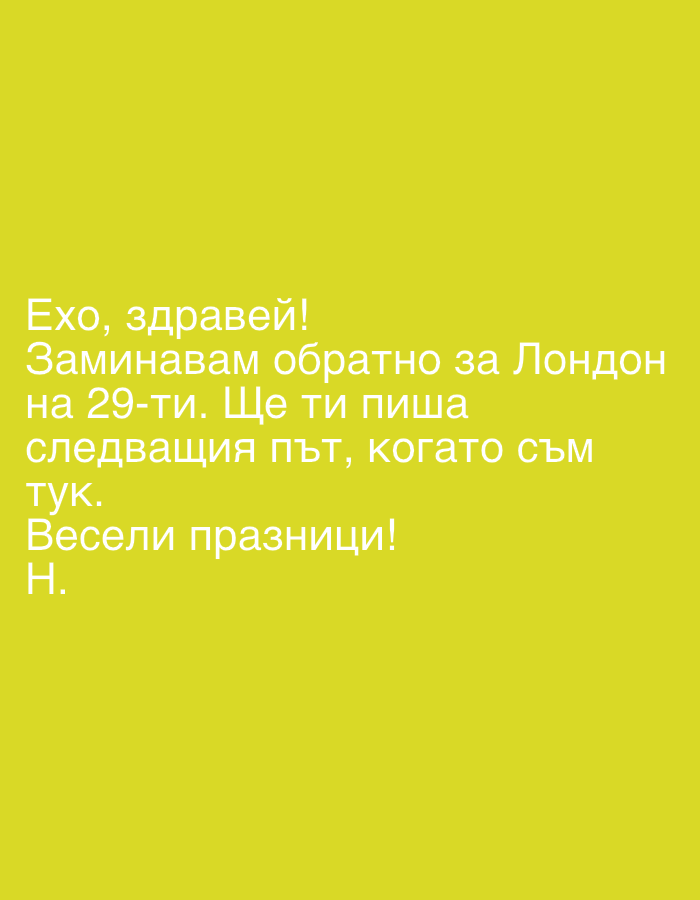 The image displays white Cyrillic text centrally positioned on a solid yellow-green background. The text translates to: "Hello, hi! I am leaving back for London on the 29th. I will write to you next time I am here. Happy holidays! N." The content is a personal message from a sender, identified by the initial "N.", communicating travel plans and a festive greeting. The digital image provides no visual information or contextual clues to determine a specific physical location within the city of Stoikite, Bulgaria, or any other geographical area. The environment is entirely digital with no discernible physical objects or individuals depicted.