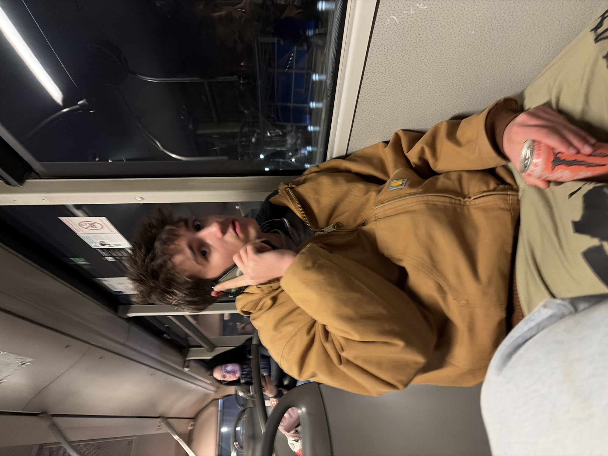 The image captures the interior of a public transport vehicle, identified as a bus or tram, operating in Sofia, Bulgaria, during nighttime. In the immediate foreground, a young male individual with light brown, tousled hair is seated, his body angled slightly left but his gaze directed forward. He wears a brown, zippered jacket with a small yellow and black emblem on the left chest pocket, over a dark shirt, and light khaki trousers. His right hand is raised, holding a black smartphone to his right ear, indicating he is on a phone call. His left hand clutches a red-pink "Monster Energy" drink can. Behind the primary subject, in the middle ground, a female individual with dark hair and glasses is partially visible, seated. She appears to be looking downwards, possibly at an object in her lap. The vehicle's interior features gray plastic seating with a subtle textured pattern on the backrest, along with metal grab bars and overhead fluorescent lighting fixtures. A "NO SMOKING" symbol is affixed to the window frame on the right. Through the vehicle's windows, a dark urban exterior is visible, characterized by distant lights and the vague outline of a blue structure.