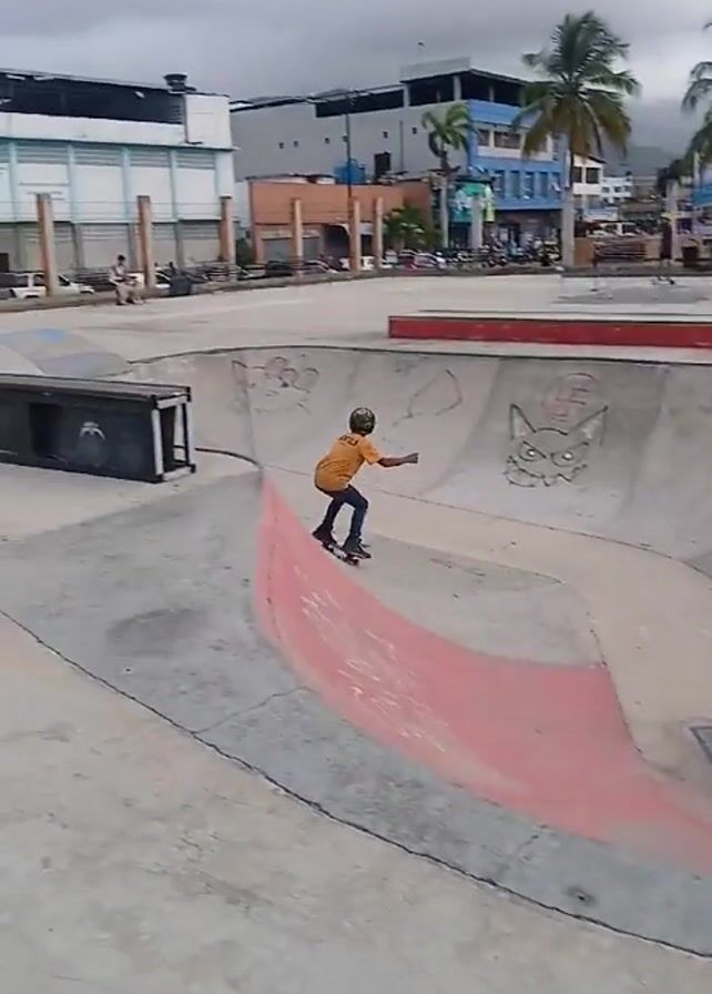 - "A young child on a skateboard is riding in a skatepark, moving from the bowl area toward some low rectangular ledges" by FM-YF5w12, licensed under CC BY 4.0