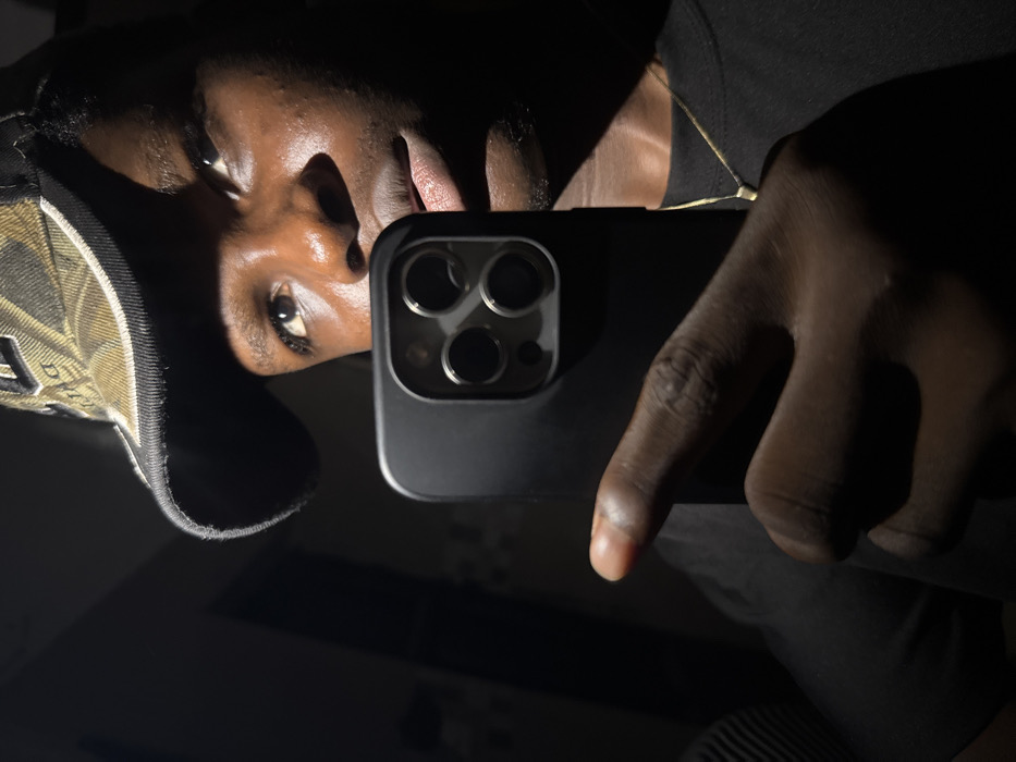 A person with dark skin takes a selfie with a smartphone. The phone's camera array is visible. The individual wears a dark t-shirt and a cap with a camouflage pattern. A thin gold chain is around the neck. The background is very dark, with only faint details visible. The face is partially illuminated, with stark contrasts of light and shadow.