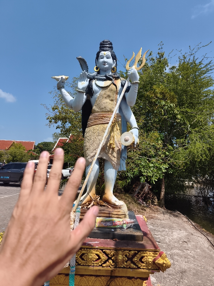 A light blue, four-armed statue of Shiva stands outdoors. The statue is on a decorated, golden platform and holds a trident, a shell, and a drum. Lush green foliage surrounds it, with a body of water visible behind. A hand is superimposed in the foreground, partially obscuring the view of the statue. The sky is bright blue, suggesting a clear day. Buildings and cars are visible in the blurred background.
