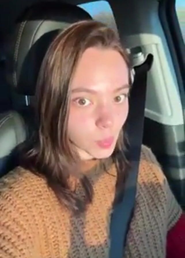 A woman is sitting in the driver's seat of a car. She is wearing a brown sweater and a seatbelt. She sticks her tongue out at the camera, and then makes a face. The sky is visible through the car window.