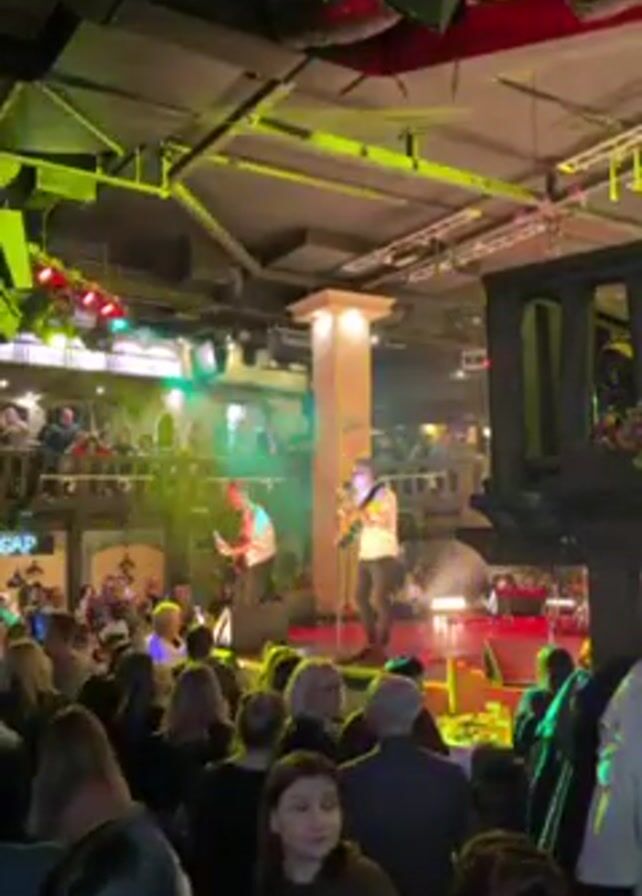 A large crowd is watching a band perform on a stage in a multi-level restaurant or venue. Two band members are visible on stage. The crowd is dense, with many people holding up phones to record the performance. The venue has a unique, slightly medieval, decorative theme, with a faux windmill and even a decorative guillotine. The lighting is colorful and vibrant. There are balcony seating areas overlooking the stage, and a bar area is visible to the left.