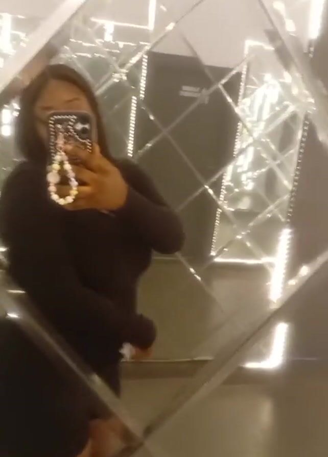 A woman stands in an elevator, taking a selfie in the mirror. She is wearing a black, long-sleeved mini dress and holds a phone with a beaded charm in her hand. The elevator's interior is mirrored with geometric patterns and illuminated with white lights. A sign on the back wall indicates the men's restroom.