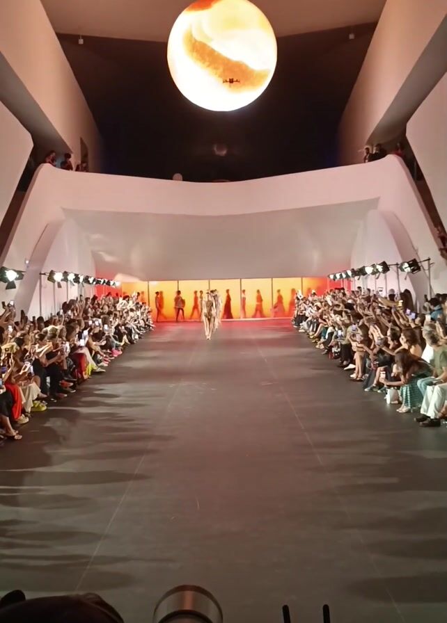 fashion show. Models are walking down a long runway, towards the camera. On either side of the runway, people are sitting, holding up phones, presumably to take pictures or record videos. Above the runway, a large spherical light is suspended. There is a camera in the foreground filming the show. The room is wide and tall with a contemporary architectural design.