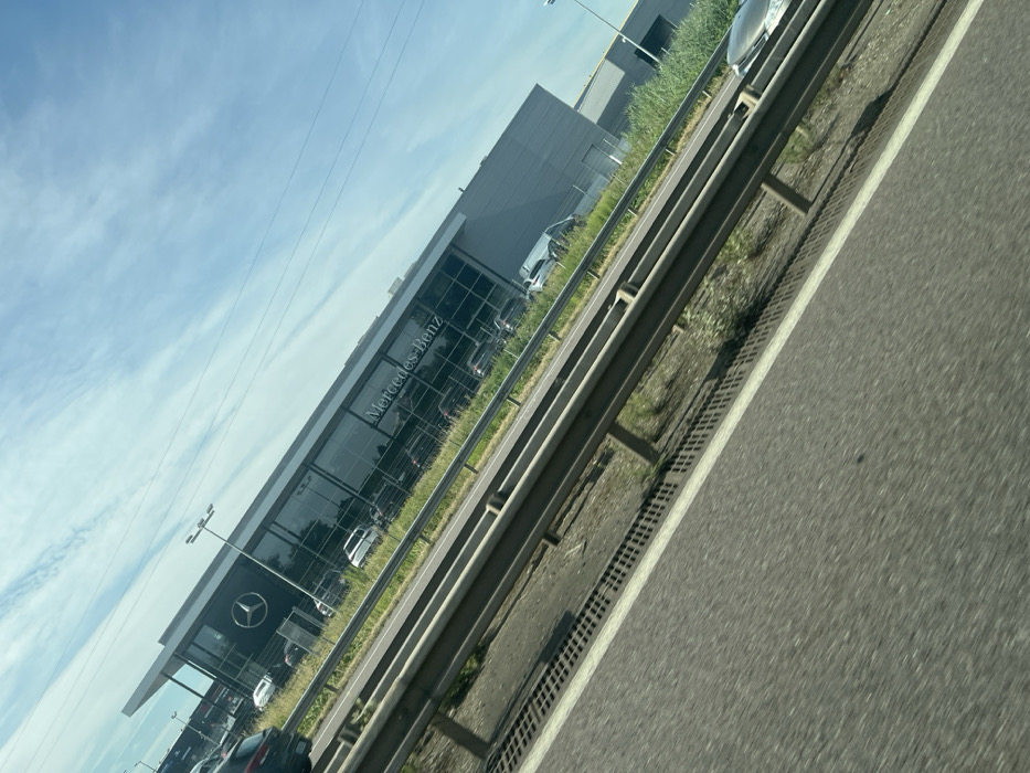 A tilted roadside view presents a Mercedes-Benz dealership with its logo prominently displayed on the building's facade. Several vehicles are visible inside the dealership. A highway with a guardrail runs adjacent to the building. The sky is partly cloudy. The photo appears to be taken from a moving vehicle.