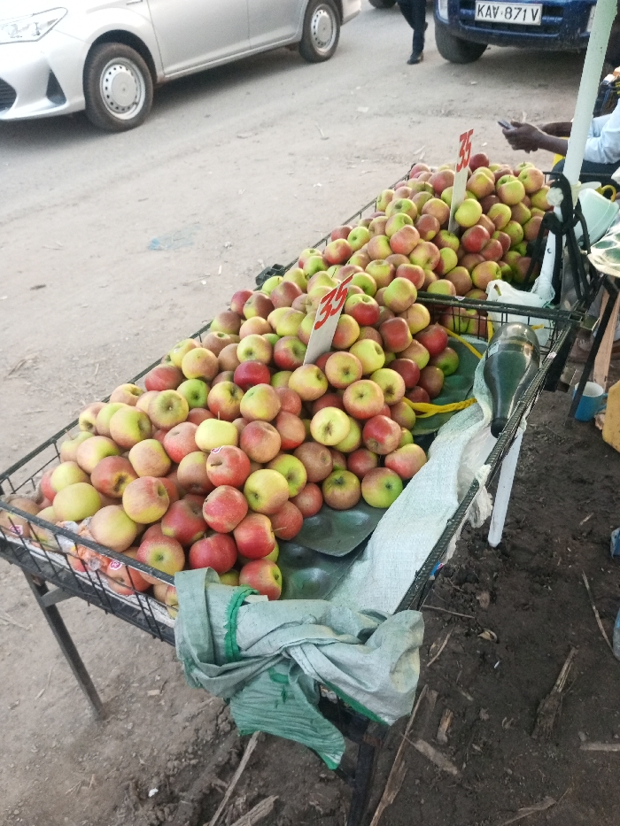 - "The image displays an outdoor market stall in Matungulu west ward, Kenya, featuring a prominent display of red and green apples" by FM-XIT4O2, licensed under CC BY 4.0