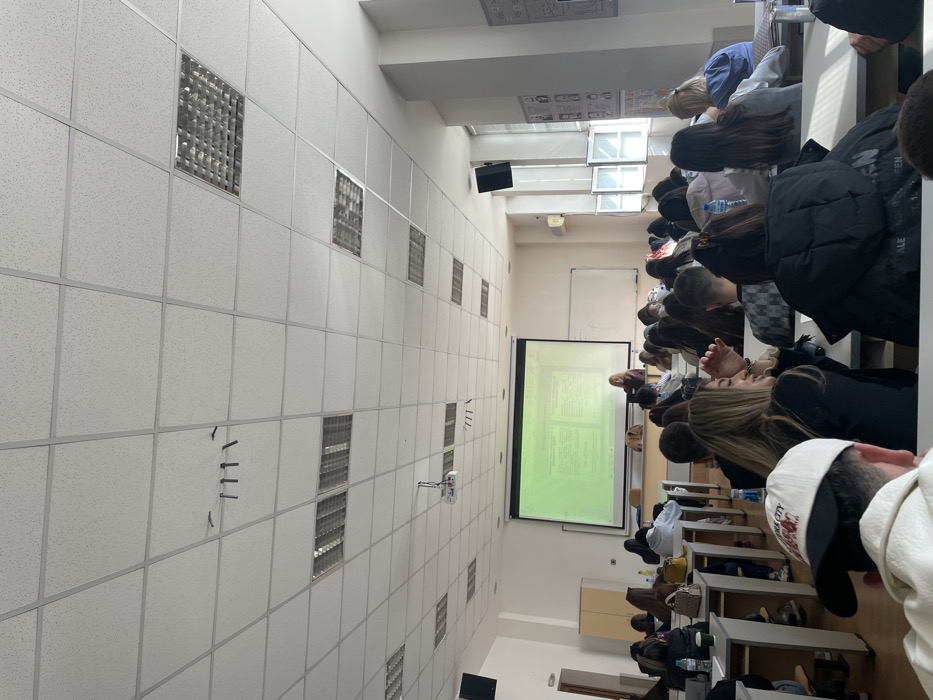 The image depicts a densely populated lecture hall within an educational facility located in Plovdiv, Bulgaria. Approximately 40 to 50 individuals, primarily young adults presumed to be students, are seated at light-colored individual desks arranged in multiple rows. At the front of the room, an instructor with long brown hair stands, facing the students, presenting lecture material projected onto a large, illuminated screen displaying greenish text and diagrams. Adjacent to the screen are two whiteboards. Overhead, a grid of white acoustic ceiling tiles features recessed fluorescent light fixtures, along with wires or conduits hanging from one tile in the upper center. Natural light enters through large windows on the right wall, augmented by the artificial ceiling lighting. Wall-mounted speakers are visible near the front corners. On the left wall, light-colored storage cabinets are present. The student closest to the camera, with their back visible, wears a white baseball cap inscribed "NEW YORK CITY" and a white jacket. In the mid-ground, a female student is observed smiling and looking slightly to her right, indicating an interaction. Most other students face forward, seemingly attentive to the presentation. Water bottles and personal bags are visible on several desks.