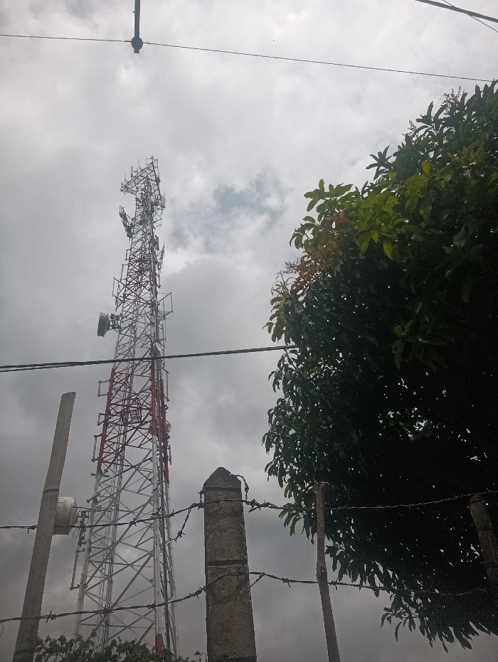 A tall, red and white communications tower rises against a cloudy sky. It's framed on the right by a leafy green tree and partially obscured by a barbed wire fence in the foreground. Concrete posts support the fence, adding a sense of enclosure. Power lines cut across the upper portion of the image. The overall mood is overcast and somewhat industrial.