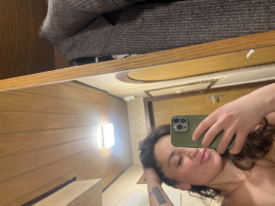 A selfie is reflected in a mirror. A woman holds an olive-green iPhone to capture the image. She has dark curly hair, fair skin, and tattoos on her arm and wrist. Behind her in the reflection is a room with wood paneling, a rectangular light fixture, a door, and possibly a sink. Above the mirror is a shelf with a brown tweed garment.