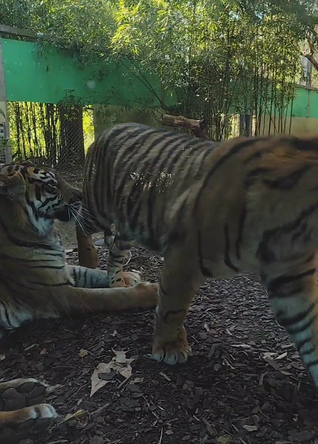 - "Two tigers are in an outdoor enclosure with a mulch ground and a backdrop of trees and green walls" by FM-GiKA22, licensed under CC BY 4.0