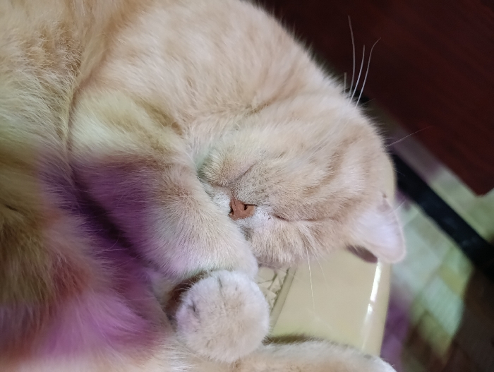 This image displays a cream-colored domestic cat sleeping in a curled position. The cat's eyes are closed, and its front paws are tucked closely to its face, partially obscuring its nose and mouth. Its fur appears dense, with lighter and darker patches of cream and light orange. A prominent purple-pink light source casts a hue across the cat's left side and chest. The cat is resting on a smooth, light beige surface, which exhibits a slight sheen. The background is out of focus, revealing a dark brown, possibly wooden, surface in the upper right, and a lighter, indistinct patterned surface below it. The scene is observed within an interior setting in the city of Al-Qutaifa, Syria.