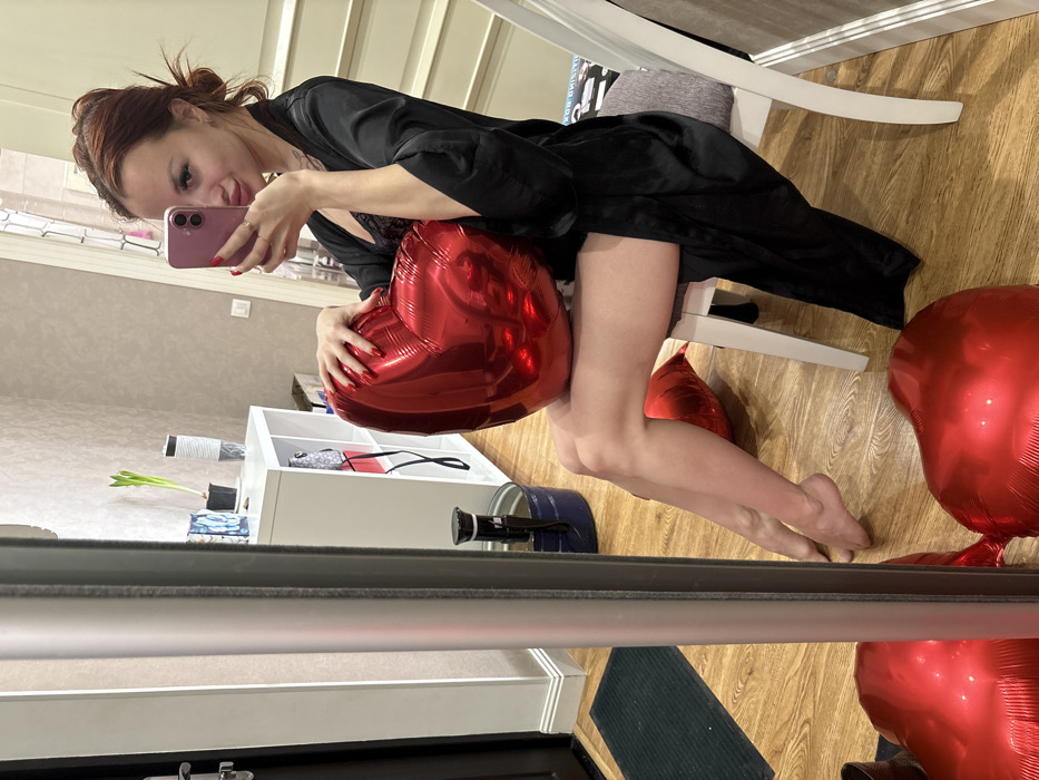 The image depicts the reflection of an adult female taking a mirror selfie in an indoor residential setting, located in Перовское сельское поселение, Ukraine. The female, with reddish-brown hair styled in a bun, is seated on a white chair with a grey cushion, facing towards her left. She wears a black, short-sleeved, satin-like robe over a black lace garment. Her left leg is bent with her foot resting on the floor, while her right leg is extended forward. She is barefoot. Her right hand holds a pink smartphone at face level, partially obscuring her mouth, while her left hand rests on a large, red, heart-shaped foil balloon positioned on her lap. Her fingernails are painted red. She is looking directly at the phone with a slight smile. Two additional deflated red heart-shaped foil balloons lie on the light brown wooden plank flooring in the foreground. In the background, to the viewer's left, a white cube shelf unit is visible, holding a potted plant with long green leaves and other indeterminate objects. Further left, a dark brown door with a metallic handle is partially visible, with a dark mat on the floor adjacent to it. A dark blue bucket containing a black, cylindrical object is also on the floor near the door. The walls are covered with light-colored, textured wallpaper.