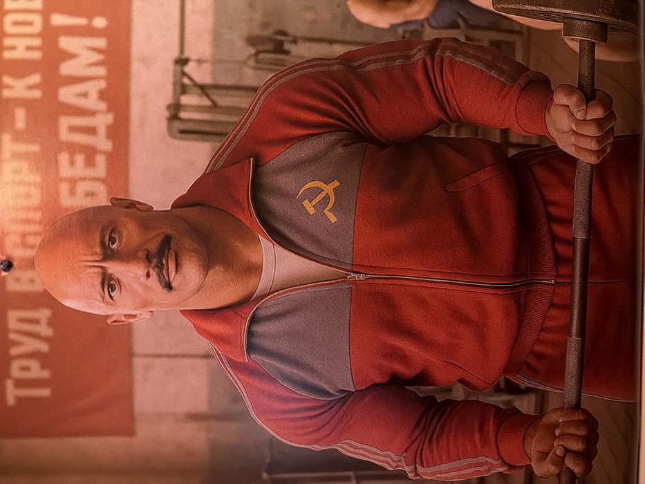 The image displays a photograph of a large poster featuring a depiction of actor Dwayne "The Rock" Johnson. Johnson is rendered as a bald, muscular man with a dark, prominent mustache, looking directly forward with a serious expression. He is wearing a red and grey zip-up tracksuit, with a gold hammer and sickle emblem prominently displayed on the left chest. Both hands firmly grip a barbell at approximately waist height, indicating a weightlifting posture. The background within the poster depicts a blurred indoor environment consistent with a gymnasium, showing metal exercise equipment on the right side. Above Johnson, a large red banner with white Cyrillic text is visible. Partial text reads "ТРУД В СПОРТ - К НОВ" and "БЕДАМ!", translating to "LABOR IN SPORT - TO NEW VICTORIES!". The poster itself is affixed to an unseen surface, likely a wall, evidenced by a single black pushpin visible at the top center. The overall photograph possesses a warm, slightly reddish hue. The specific location within Hrodna, Belarus, cannot be precisely identified from the visual information provided; however, the poster's aesthetic strongly suggests a setting that incorporates Soviet-era cultural or sports themes, such as a gym, sports club, or historical exhibit in the city.