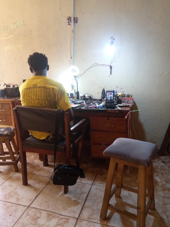 A male individual, seen from behind, occupies a wooden chair with a padded seat and backrest, positioned at a wooden desk in an indoor workspace. He wears a yellow short-sleeved t-shirt printed with "20XX RHO STATE CHAMPIONSHIPS" text. A black shoulder bag hangs from the back of his chair. The desk surface is cluttered with various electronic components, wires, a small black container, and a digital display unit, illuminated by a small circular desk lamp and a bare incandescent bulb suspended overhead by wires. The walls are light cream-colored, with faint handwritten alphanumeric characters visible on the left wall, including "8023418646" and "2013758002". A white vertical conduit pipe is present in the background corner, with two small images affixed to the wall near its top. The floor is tiled with light-colored square tiles. A small wooden stool with a dark padded seat is partially visible to the left, and a taller wooden stool with a light grey padded seat stands in the right foreground. The location is an unspecified room in the city of Unknown, Unknown.