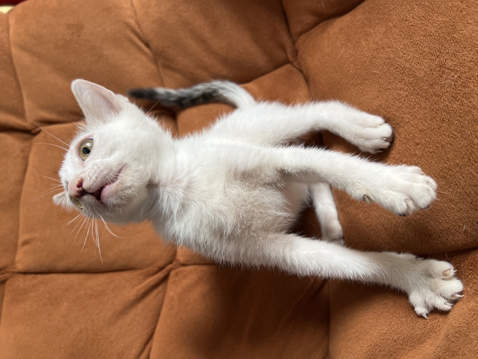 A white kitten with yellow eyes lies on a brown, quilted surface. The kitten is on its back with its legs stretched out. Its tail is short and grey. The kitten's mouth is slightly open, showing a hint of pink inside. Long, white whiskers extend from its face.