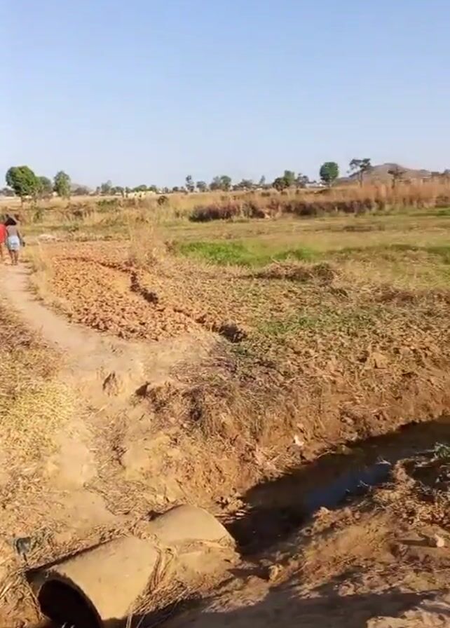 rice farm on a clear, sunny day. Two people walk along a dirt path that runs through the farm. The path leads to a concrete pipe. Beyond the pipe, the farm consists of tilled land with patches of green grass. Further on, there is a small pool of water, and in the distance, some houses can be seen. The camera pans across the rice farm to showcase the landscape.