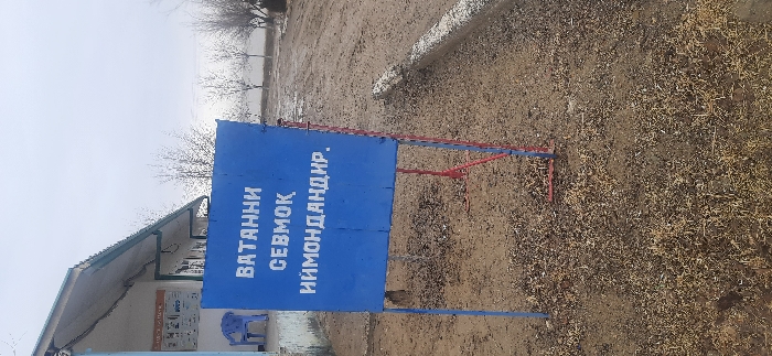 A blue sign with white lettering is displayed on a red and blue metal stand. The text on the sign is vertical. The sign is positioned in a landscape of dry soil and sparse vegetation. A building with a slanted green roof is partially visible on the left. In the background, barren trees and a body of water can be seen under a cloudy sky.