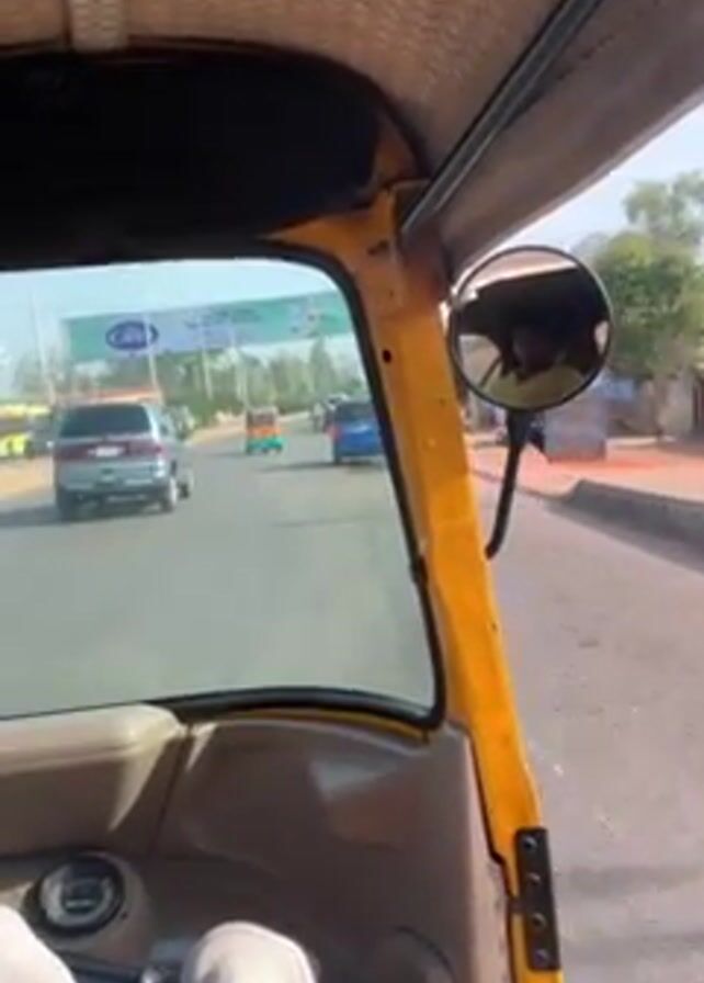view from inside a yellow auto-rickshaw, also known as a tuk-tuk, driving on a road