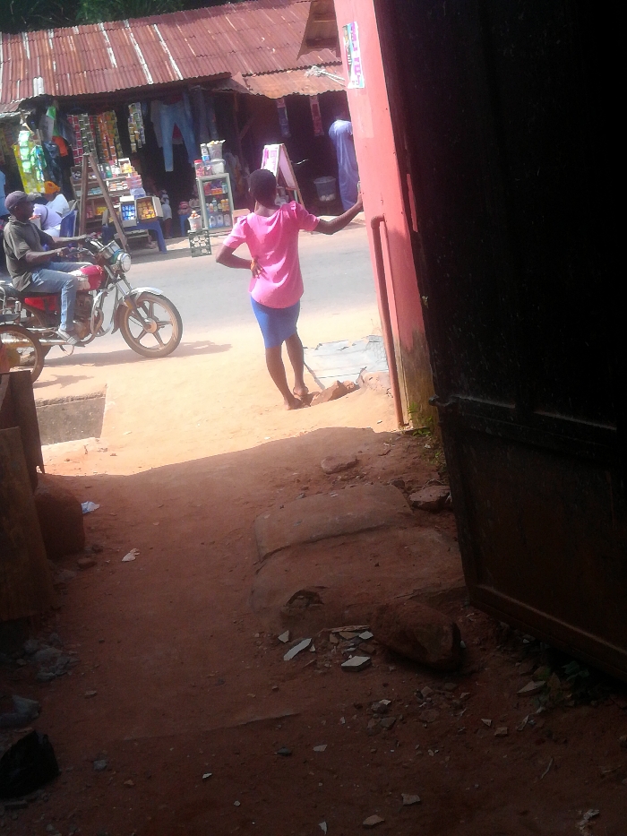 This image depicts a sunlit street scene in Alor, Nigeria, viewed from within a shadowed doorway