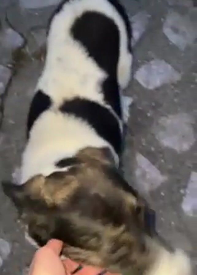 A handheld video depicts three dogs on a cobblestone surface. One dog is predominantly white with black spots, another is black with tan markings, and the third dog's colors are harder to discern due to the dim lighting but appears to be a mix of darker shades. A person's hand briefly strokes the black-and-white dog. The dogs are relatively close together and seem to be interacting casually. The video has a slightly shaky quality due to the handheld nature of the recording.