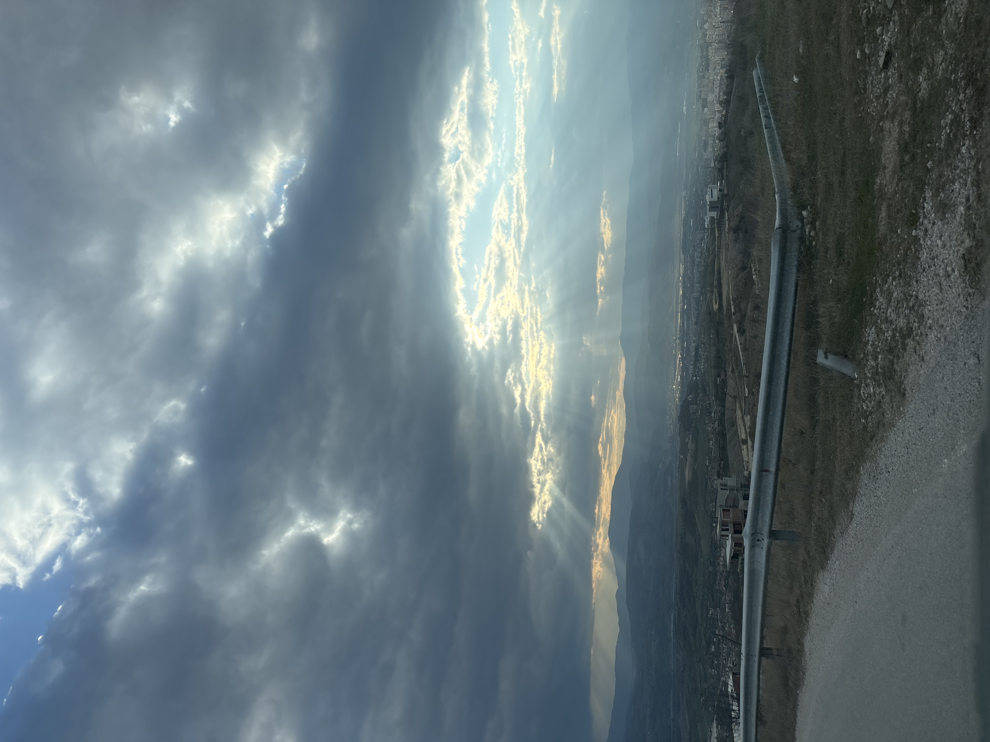 The image presents an elevated panoramic view overlooking the city of Marulevo, Bulgaria, under a dramatic sky. The upper two-thirds of the frame are dominated by a heavy, overcast cloud layer, with shafts of sunlight (crepuscular rays) piercing through breaks in the clouds, particularly on the right side, illuminating sections of the distant landscape. The sky transitions from dark grey and blue-grey clouds overhead to brighter, sunlit clouds and patches of pale blue sky where the light breaks through. In the foreground, the lower left quadrant displays a section of an asphalt road with a gravel shoulder. To the right of the road, a silver-colored metallic guardrail, with several vertical posts, extends horizontally across the frame, then angles sharply downwards and to the right, following the contour of a grassy, unkempt slope. The ground beneath and beyond the guardrail consists of dry, sparse yellowish-brown grass and scattered rocks. The midground reveals a sprawling urban landscape identified as Marulevo, situated in a valley, with various residential and commercial buildings visible. Some structures appear to be under construction, with exposed brick and concrete elements. Beyond the city, a series of undulating hills and mountains stretch into the background, receding in layers of diminishing clarity and color, partially obscured by atmospheric haze and shadowed by the clouds above. No people or explicit actions are discernible within the scene.