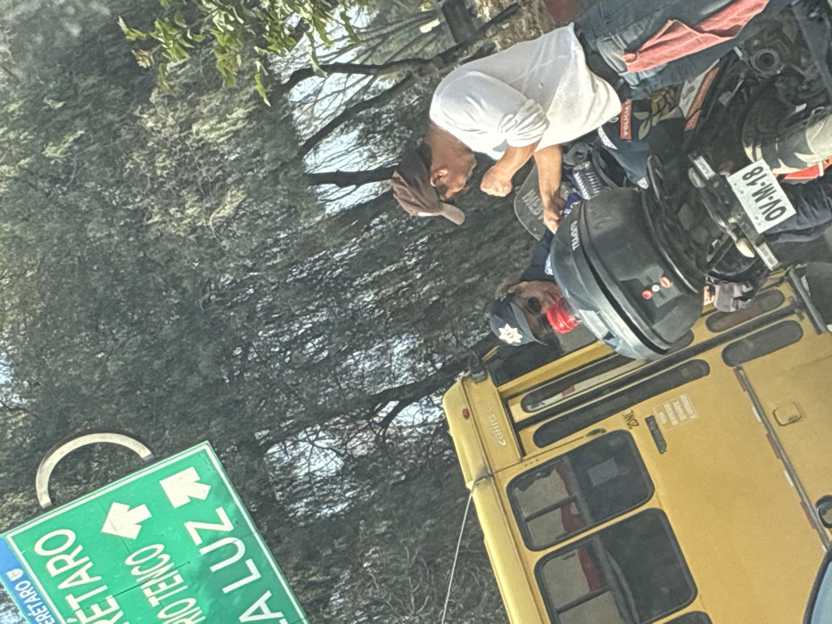 yellow bus with "TRANSITO" and "Zafira 2DNE" written on it. A motorcycle with a license plate "OV-M-18" is parked nearby. A person in a white shirt is standing next to the motorcycle. A police officer is visible near the bus. A green road sign points towards "RIO TENCO, LA LUZ" and "ERÉTARO, RÉTARO." Trees are in the background.