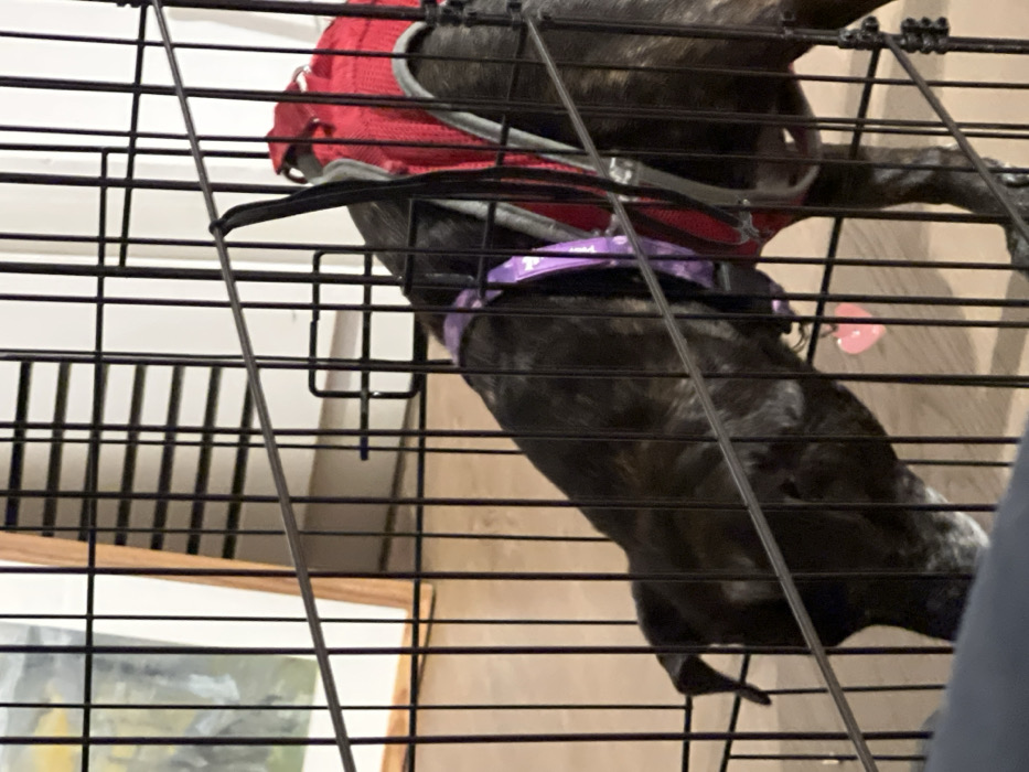 - "A black dog, likely a pet, is confined within a dark metal wire crate" by FM-Uyq9d2, licensed under CC BY 4.0