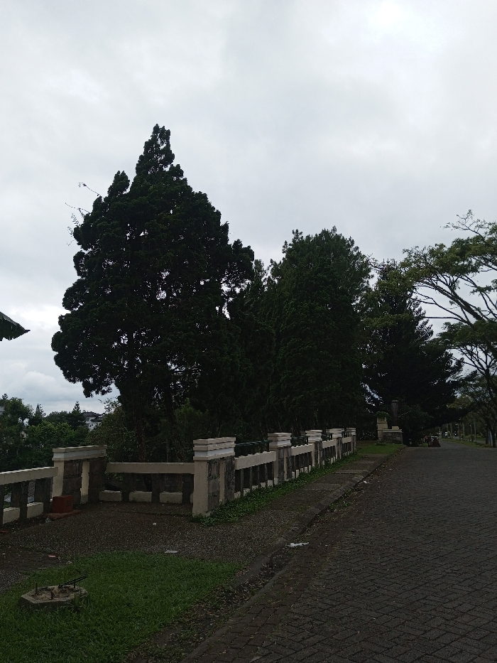 A low concrete wall runs along a paved road. Beyond the wall, tall, dark green trees rise against an overcast sky. Vegetation grows near the wall's base and on the side of the road. The road itself is made of dark bricks or stones. The scene is muted and somewhat gloomy, typical of an overcast day in a park-like setting.