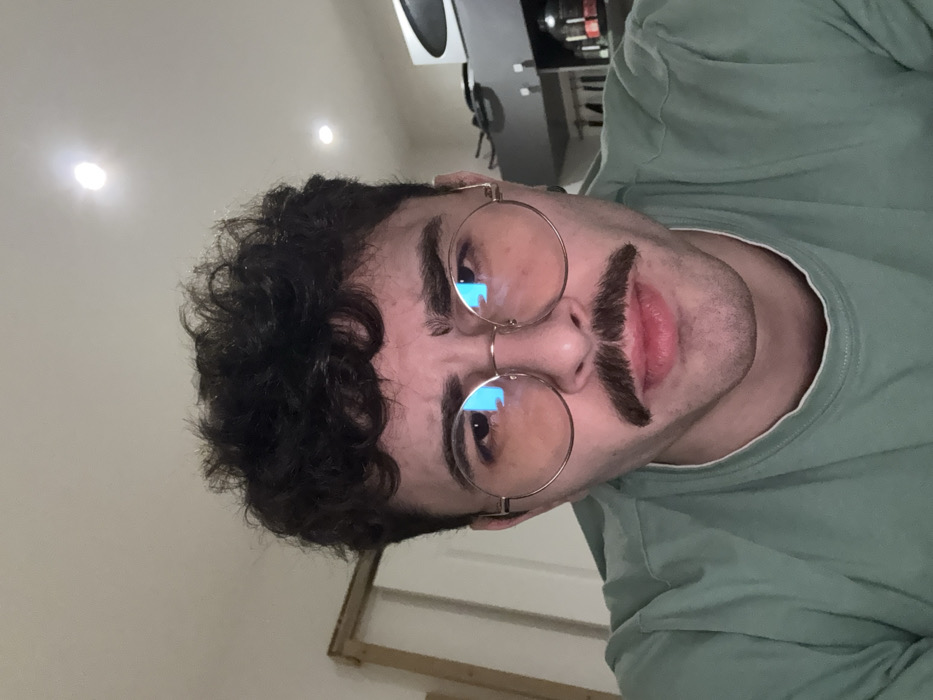 A man with dark curly hair and light skin wears round wire-rimmed glasses. A fake dark mustache is placed on his upper lip. He wears a light green t-shirt. The photo is taken at a rotated angle, with the top of his head pointing towards the left. The background shows part of a room with a light wall and a glimpse of furniture and lighting fixtures. The overall lighting is bright and somewhat diffused.