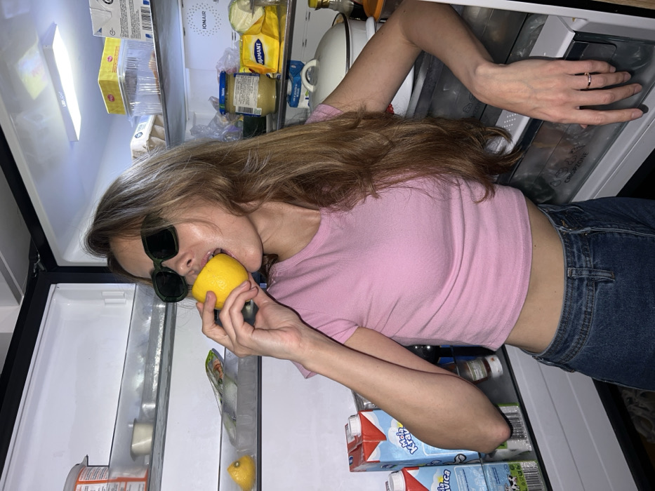 The image depicts a female individual with an open, illuminated refrigerator in the background. The specific location in the city of Bjeliši, Montenegro, cannot be determined from the visual evidence within the frame. The individual, positioned slightly off-center, wears dark green rectangular sunglasses, a pink short-sleeved crop top, and blue denim jeans. She has long, light brown hair. Her left hand holds a yellow lemon against her open mouth, indicating a biting action. Her right arm is bent, and her right hand, wearing a thin ring on the ring finger, rests on a lower drawer of the refrigerator. The refrigerator's interior contains multiple items across its shelves: a half-cut lemon, white milk cartons (branded "Mala Krava"), a yellow "DIAMANT" pouch, eggs in a clear container, various jars, and other foodstuffs. Labels such as "LED LIGHT", "IONAIR", and "CRISPY ZONE" are visible within the appliance.