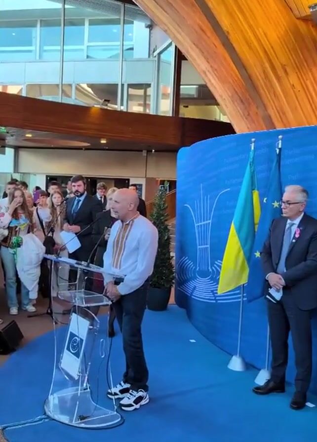 man speaking at a podium in front of a crowd. There are flags of Ukraine and the European Union behind him. The man is wearing a white shirt with traditional Ukrainian embroidery. Behind him are a man in a suit, a woman in traditional dress, and another man in a suit. The background features a blue backdrop with the logos of the Parliamentary Assembly and the Council of Europe. The setting appears to be a large hall with wooden beams in the ceiling.