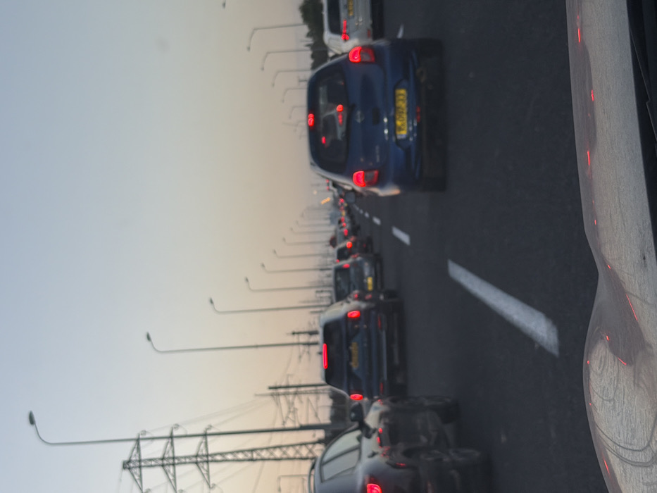 The image presents a forensic view of a multi-lane highway at dusk, located within the Sdot Dan Regional Council, Israel. The perspective is from inside a vehicle, with a portion of its dashboard visible in the lower foreground, reflecting ambient red light sources. The road features dark asphalt with white dashed lane markings separating at least two lanes of traffic moving in the same direction. Dense traffic occupies both lanes, with numerous vehicles displaying illuminated red taillights, indicating slow or stopped movement. In the immediate center-right foreground, a blue Nissan Micra hatchback (registration `75:098:33` on an Israeli license plate) is prominent, with its brake lights activated. To its left, a dark-colored SUV with illuminated taillights is positioned further back in the adjacent lane. A white car with an Israeli license plate is visible further back on the right. A continuous line of indistinct vehicles with illuminated red taillights extends into the distance. The environment includes a long row of tall, curved streetlights lining both sides of the highway, receding into the background. On the left side of the frame, a large metallic lattice power pylon with electrical transmission lines is visible. The sky transitions from a light blue at the top to a pale orange-pink near the horizon. No individuals are visible outside of the vehicles.