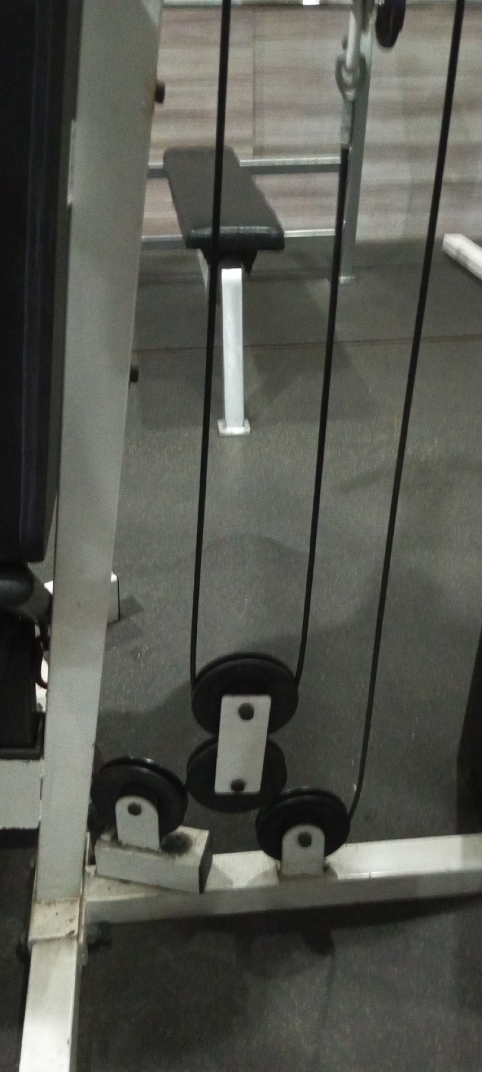 - "The image depicts an interior view of a fitness facility in Pacet, Indonesia, focusing on the lower section of a white-framed cable pulley machine" by FM-odPzg1, licensed under CC BY 4.0