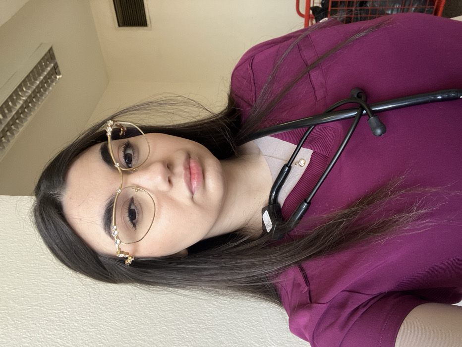 A young female subject is depicted indoors, at a location within Plovdiv, Bulgaria. She has long, dark brown hair and wears gold-framed glasses adorned with multiple clear stones on the upper frame and temples. Her face is directed towards the camera with a neutral expression. She is dressed in a short-sleeved maroon scrub top, and a black stethoscope is draped around her neck. A light-colored necklace with a small, light-colored pendant is visible over her lighter-toned undershirt or skin. The background consists of a plain, light-colored wall, with a fluorescent light fixture and a wall vent visible on the upper right. A partial view of a red metal-framed object, possibly a utility cart, is present on the far right side of the image.